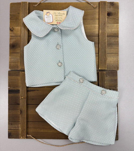 Light Blue Tweed Two-Piece Set – Vest & Shorts with Pearl & Crystal Details