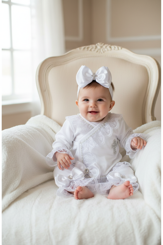 White Lace Christening Set with Crystal Bows