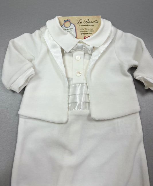 • Bimbalo Boys’ One Piece white Velvet Tuxedo Jumper With matching hat