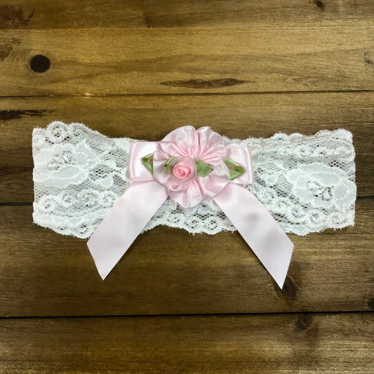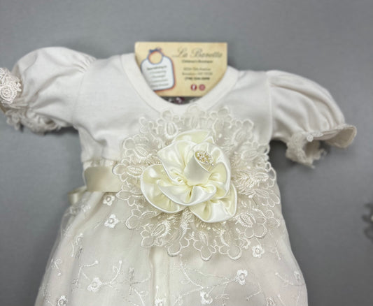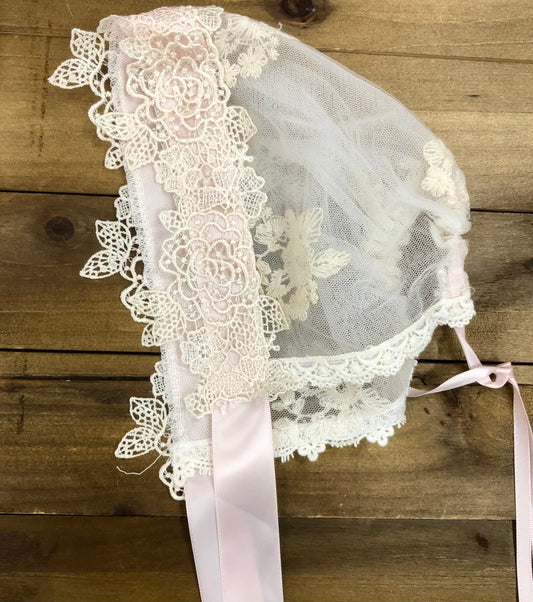 Elegant Ivory Lace Dress/Romper With Pink Details and matching Bonnet