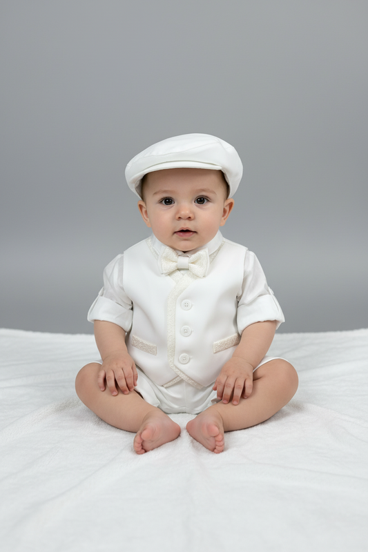 Baby Boy Christening 4-Piece Linen Set with Newsboy Cap