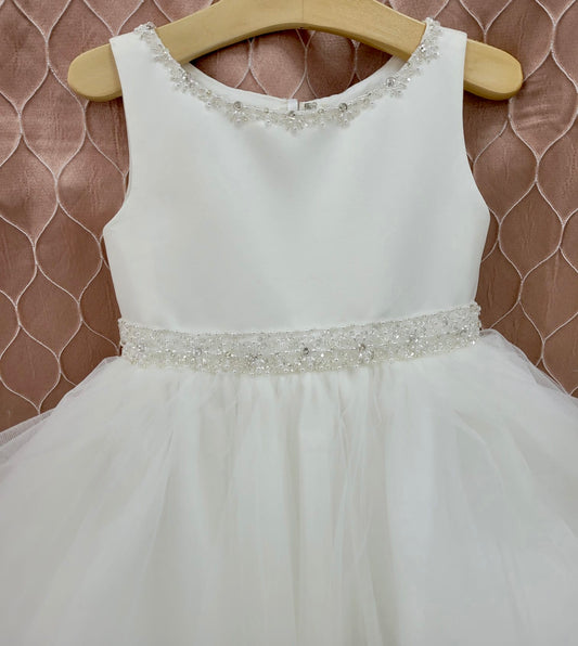 White Sleeveless Flower Girl Dress with Beads & Frills