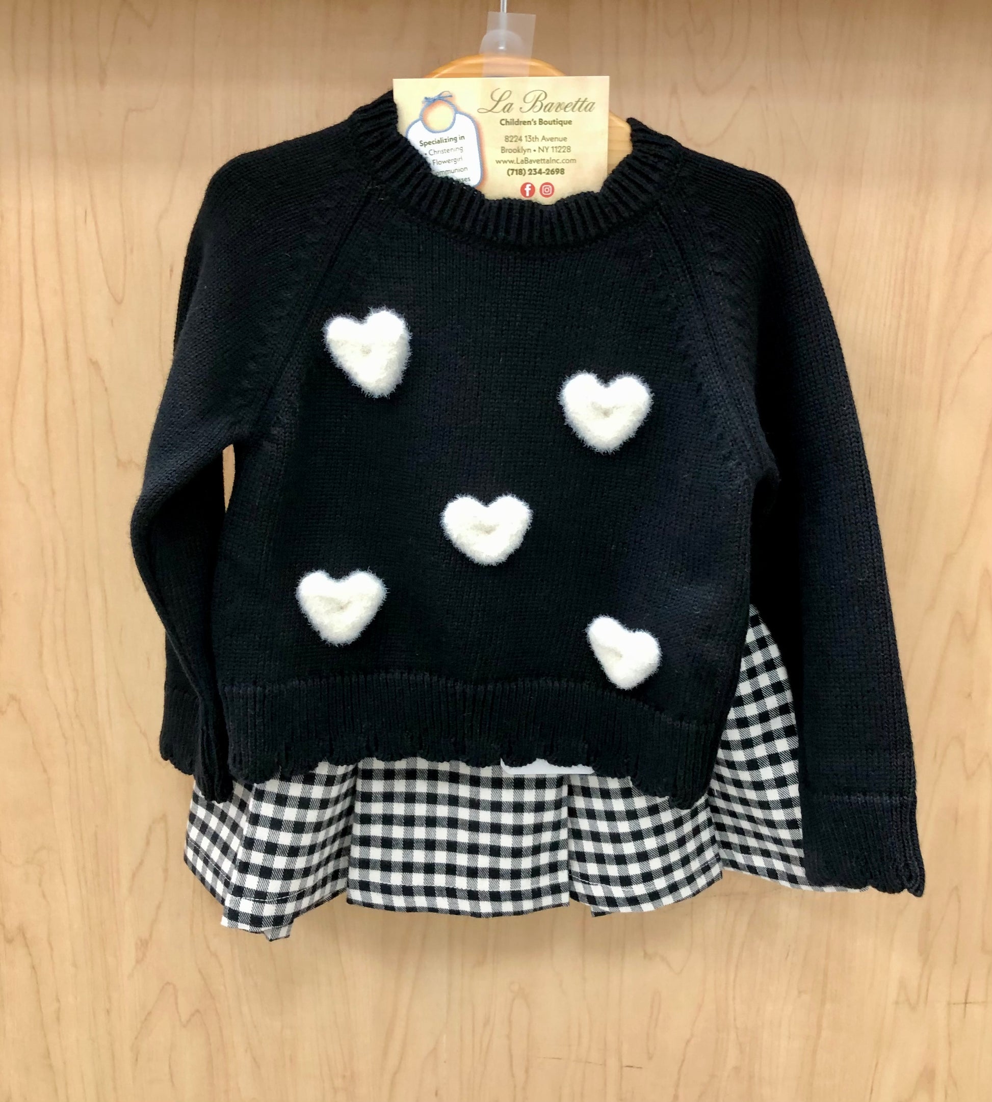 - Top: A black long-sleeve sweater decorated with multiple white heart appliqués across the front.