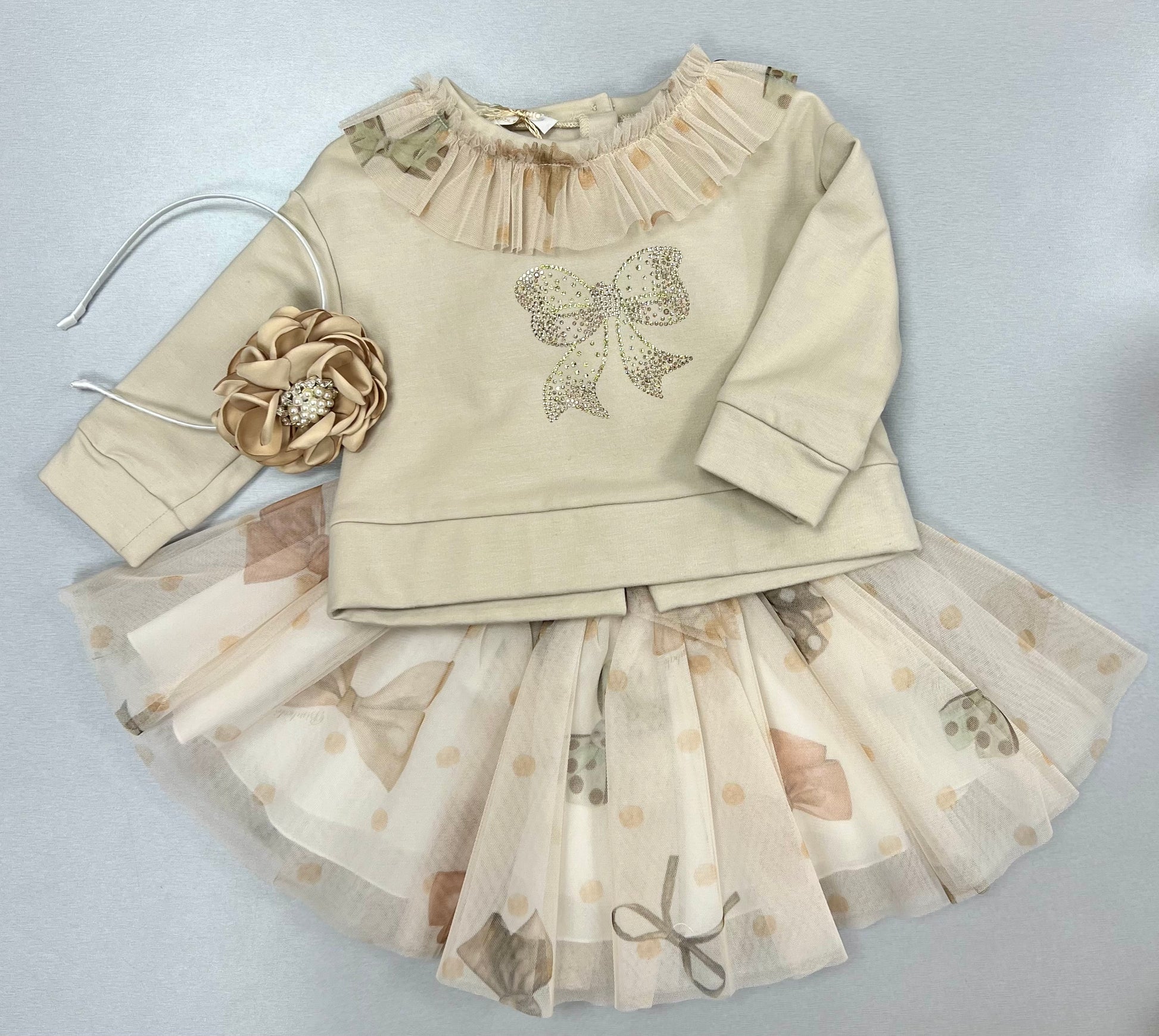 A dreamy and graceful ensemble perfect for special occasions. This champagne toned set features a soft top adorned with a sparkling rhinestone bow and a delicate tulle collar accented by soft pastel bows. The matching layered skirt shimmers with whimsical bow and polka-dot details, adding movement and charm to every twirl. Elegant, feminine, and oh-so-sweet — a timeless look for your little one's most cherished moments.