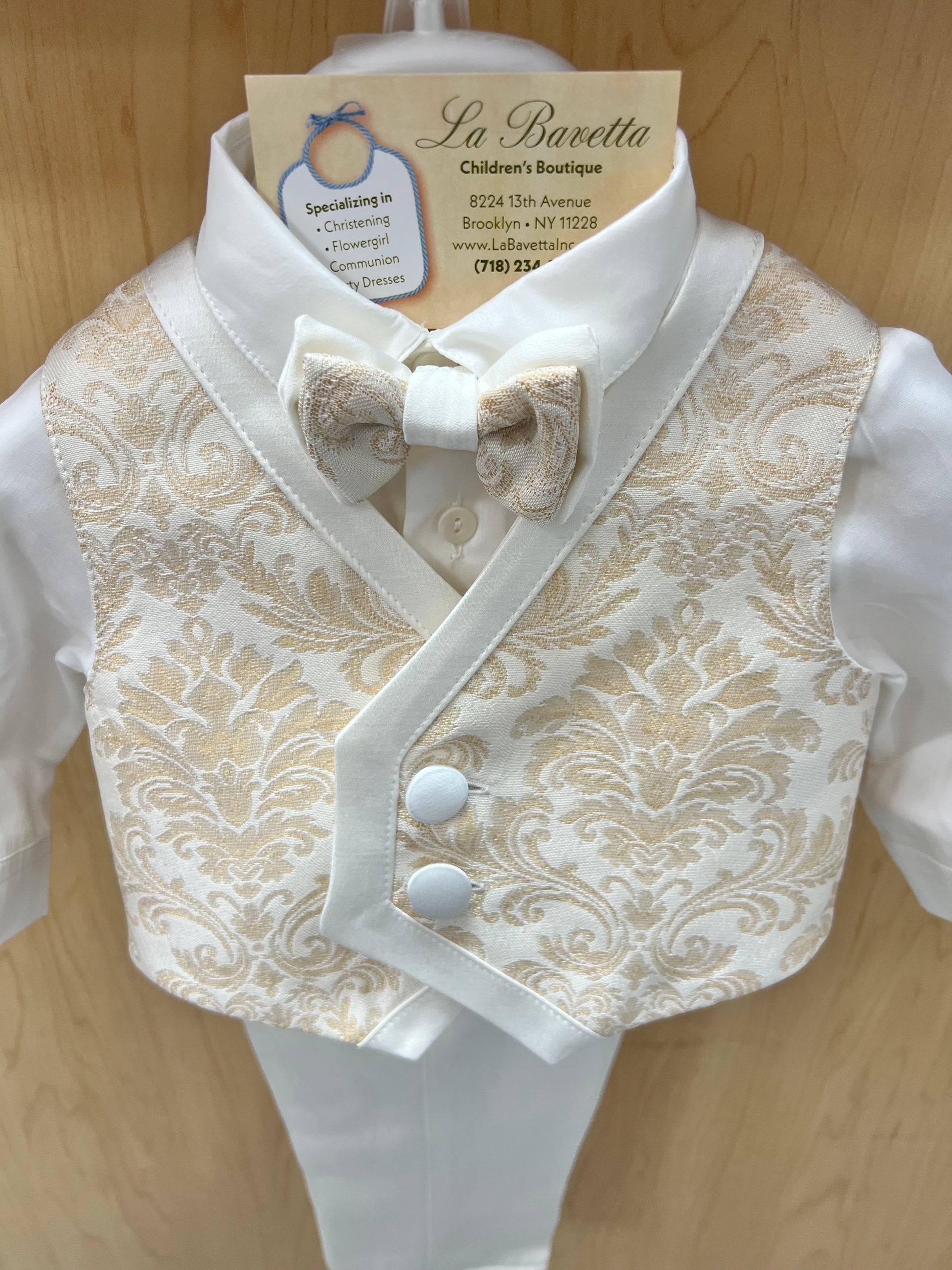 This elegant baby boy ensemble exudes timeless sophistication and charm. Featuring a crisp white shirt paired with tailored ivory trousers, the look is elevated by a jacquard-patterned vest in soft gold tones, adorned with matching fabric-covered buttons and a coordinating bow tie. Perfect for christenings, weddings, or formal celebrations, this outfit blends classic style with luxurious detailing — a refined choice for your little gentleman's most special moments.