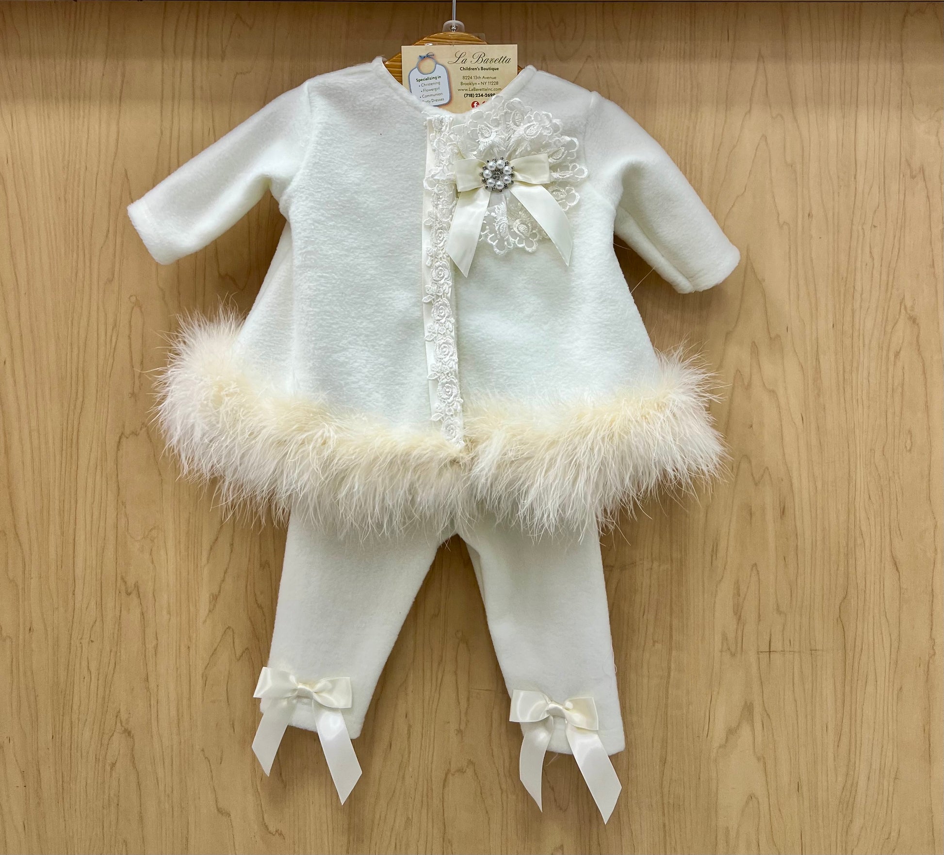 This Marabou Ivory Pant Set is perfect for the holiday season. Crafted from soft ivory fabric, it features a trim of luxurious marabou and matched with a coordinating hat for added flair. An unforgettable look for any occasion