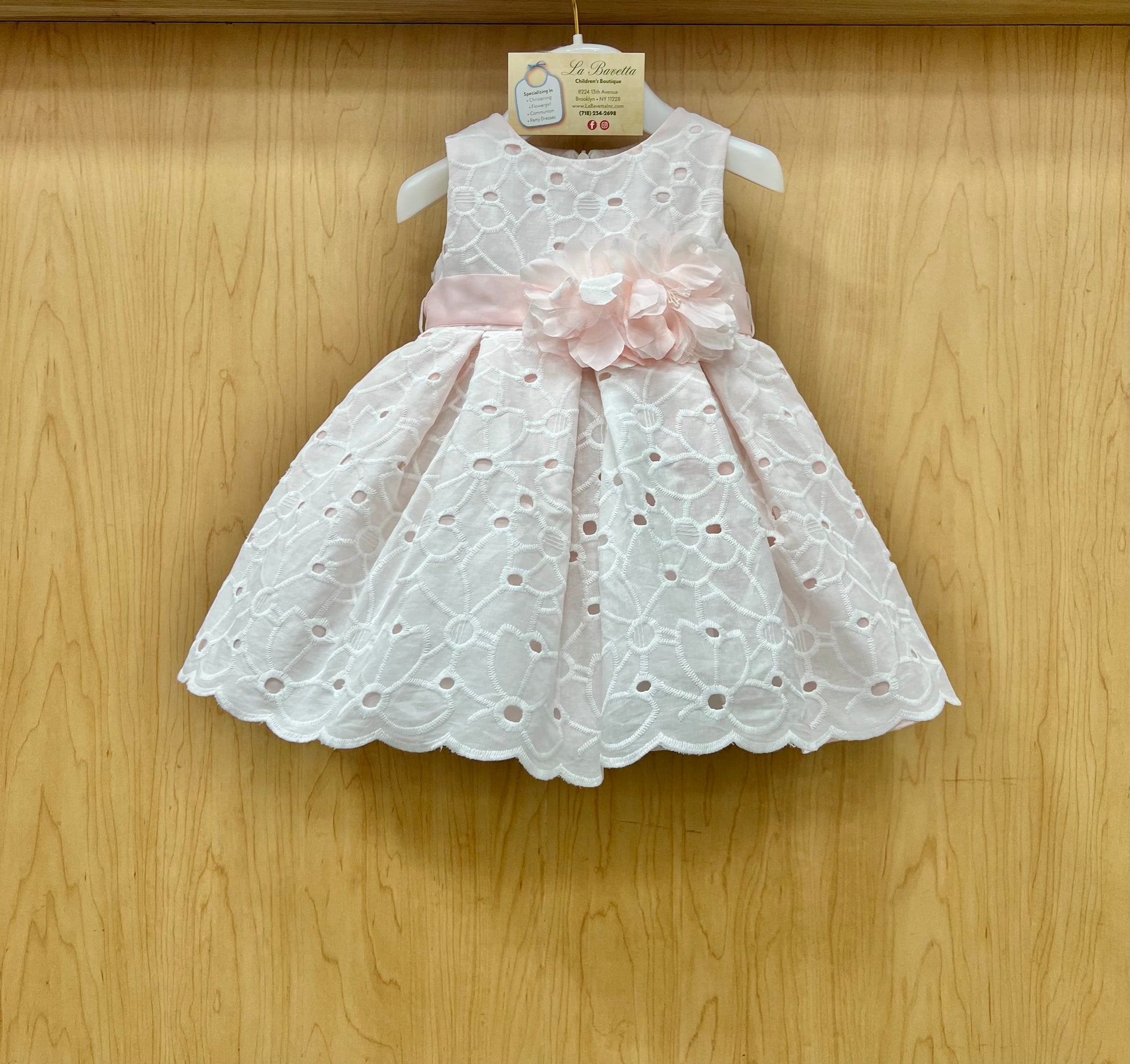 Adorable baby girl dress in soft pink with floral eyelet embroidery. Features a sleeveless bodice, scalloped hem, and a satin waistband adorned with delicate pink fabric flowers-perfect for spring celebrations or birthday parties.