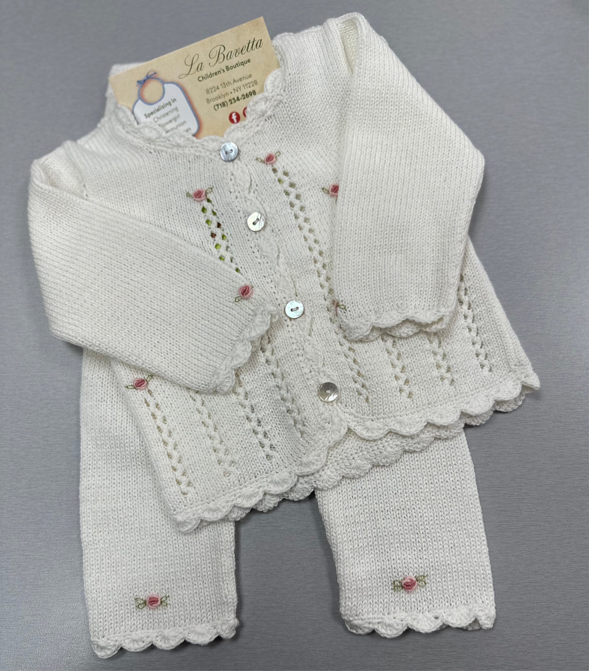 Adorable cream knit baby cardigan and pants set. Features delicate pink floral embroidery and scalloped edges. Perfect for a cozy and stylish look.
