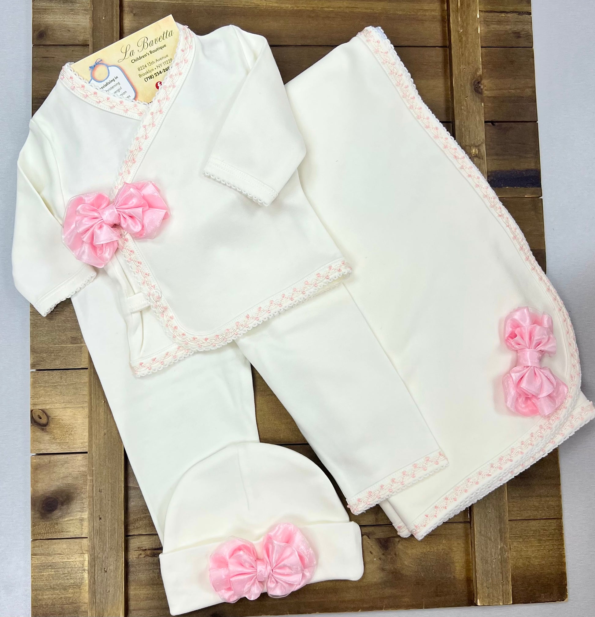 Adorable baby outfit set featuring pink bow accents. Includes top, pants, hat, and blanket.
