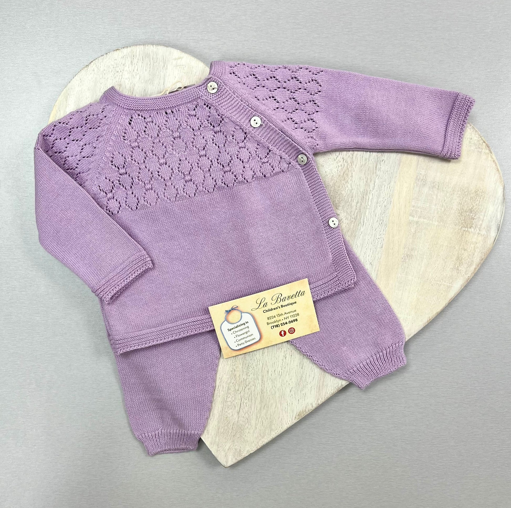 A darling lilac knit set that combines elegance with everyday comfort. The long-sleeve top features a delicate openwork knit design across the chest and shoulders, accented with side button closures for easy dressing. Paired with matching knit bottoms, this outfit is both cozy and stylish. Perfect for special outings or everyday wear, this sweet set makes a thoughtful gift for any little one.