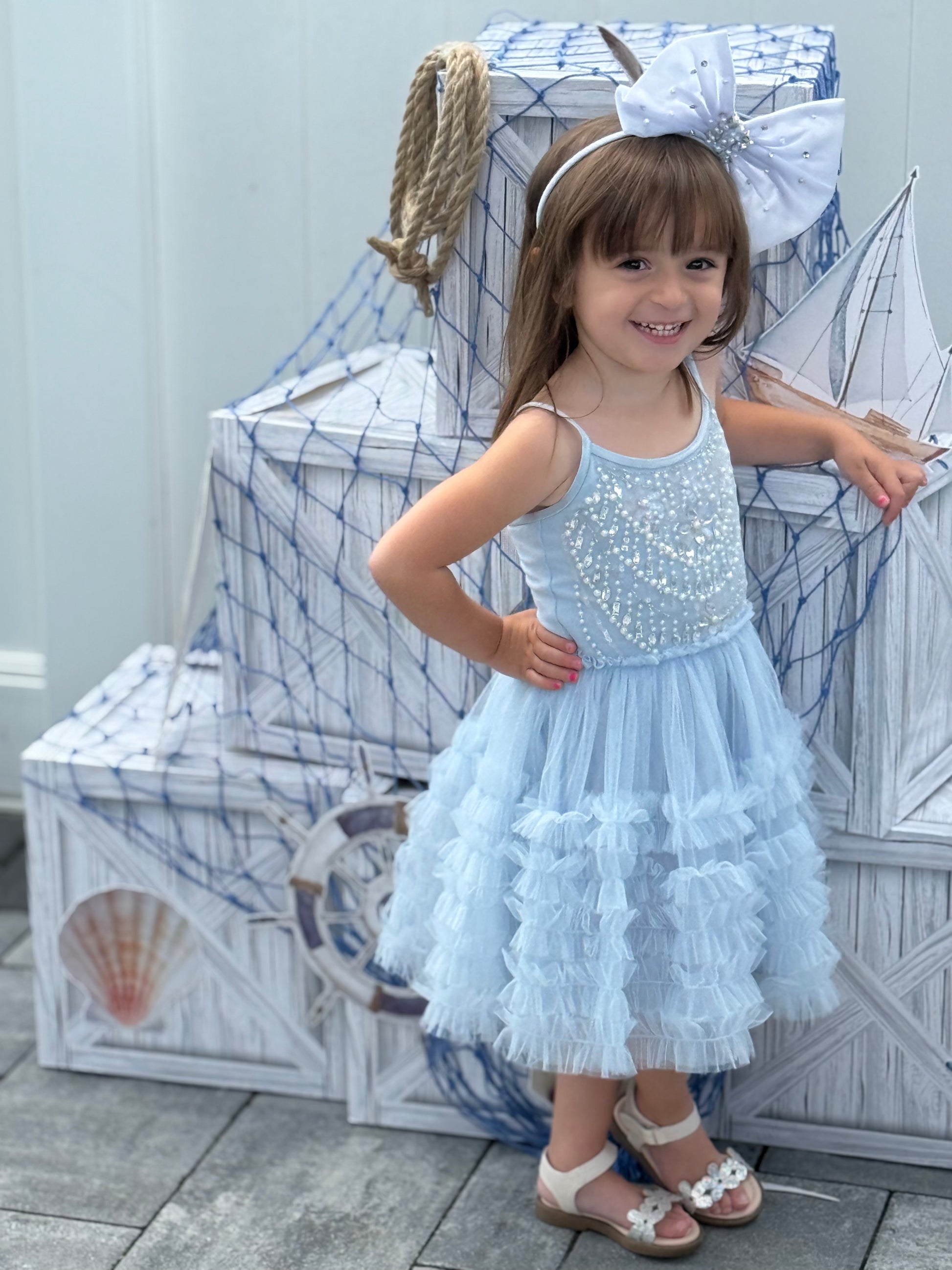 Ciel Sky Blue Tulle Tutu Princess Party Dress from Ooh! La, La! Couture is a delightful addition to any little fashionista's closet. This dress, with its exclusive prints and Swarovski crystals, is perfect for any princess party.