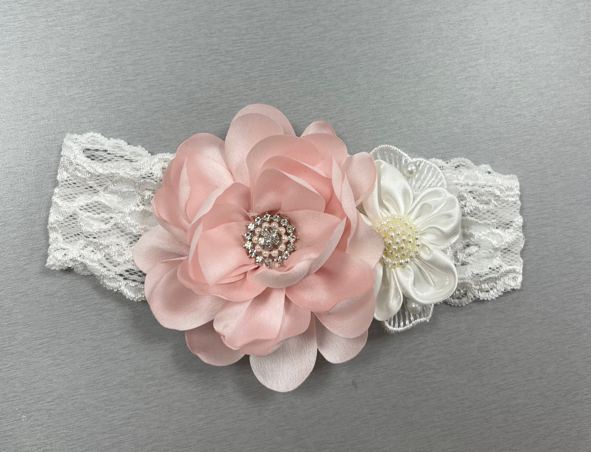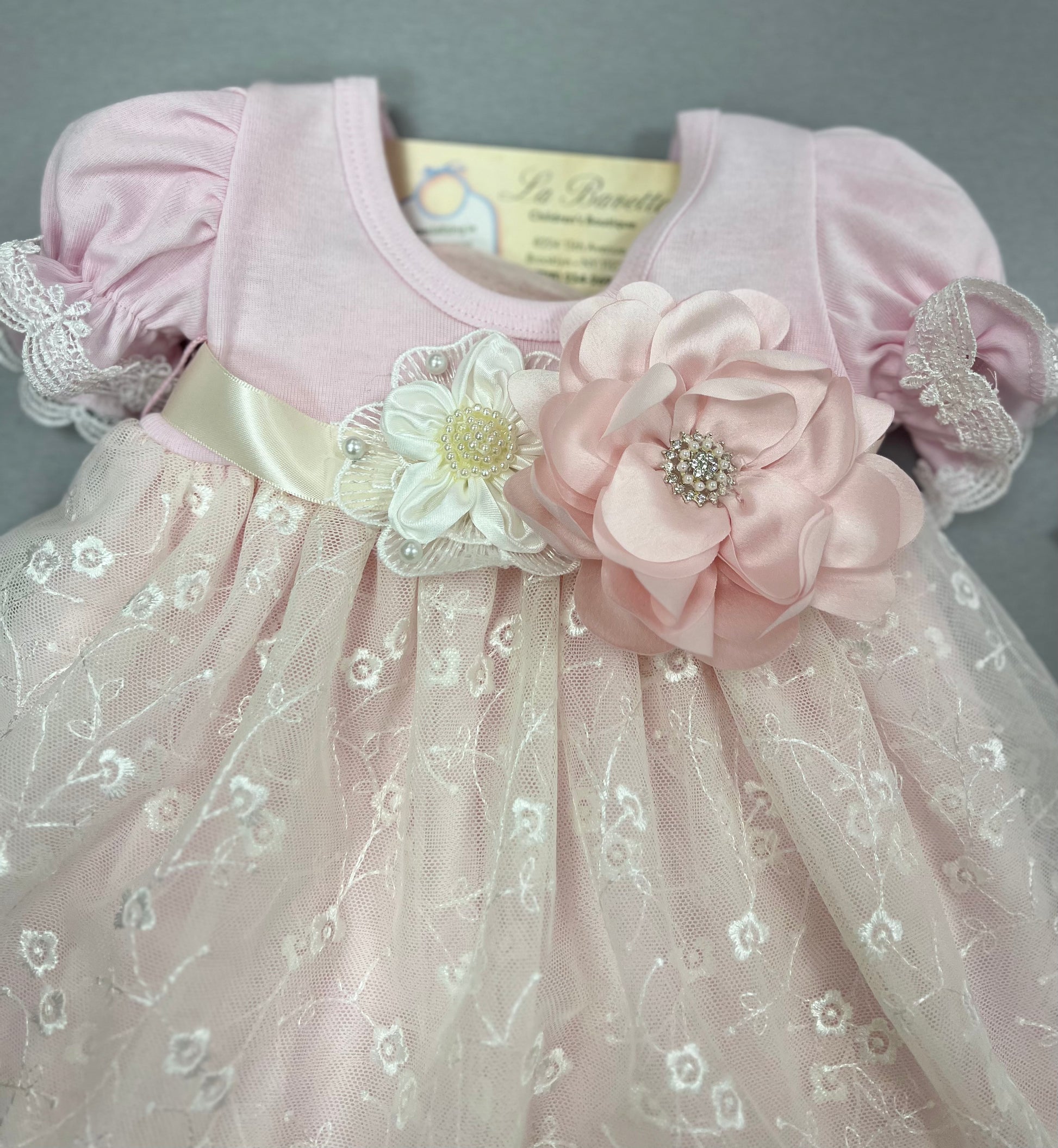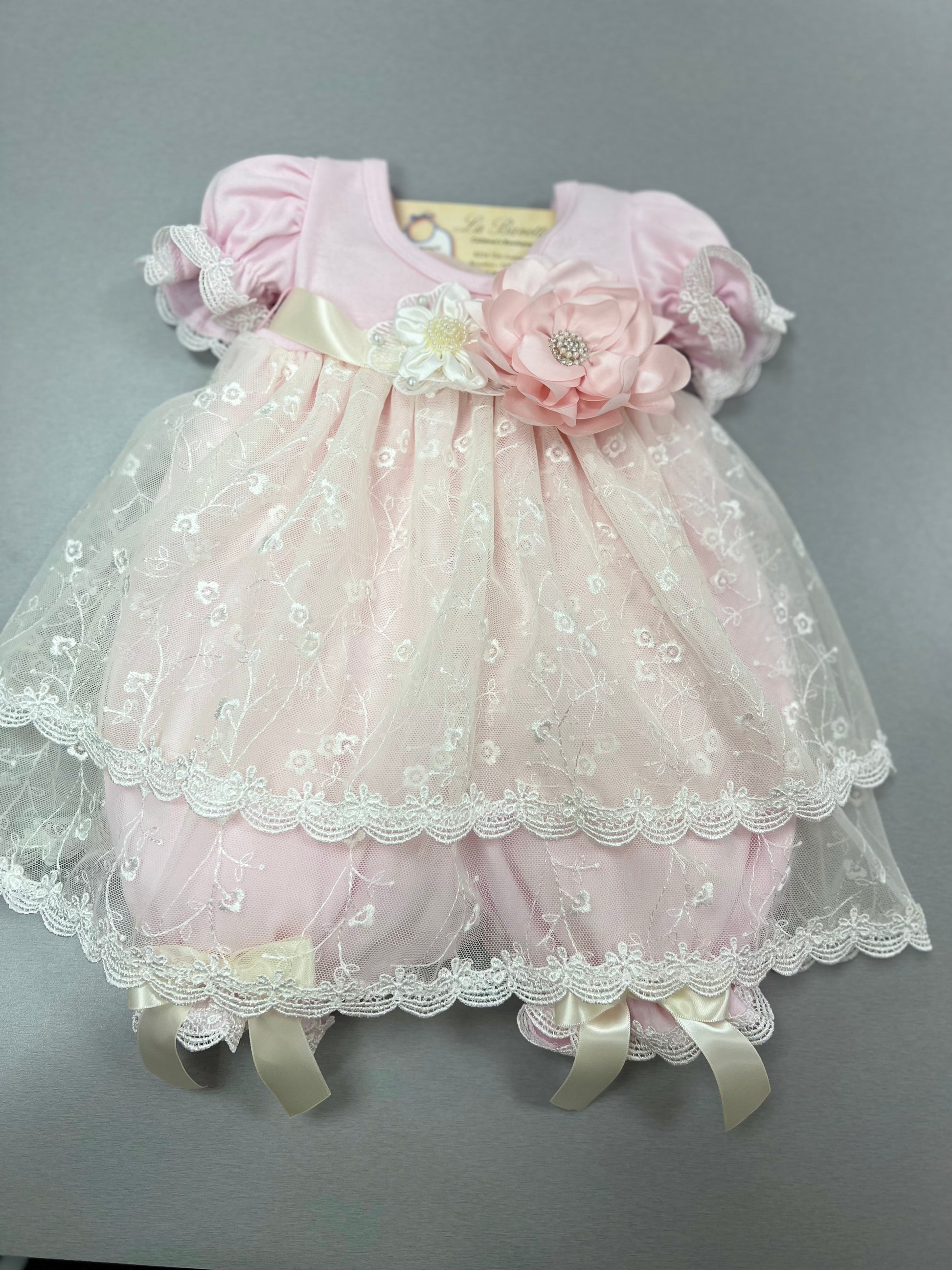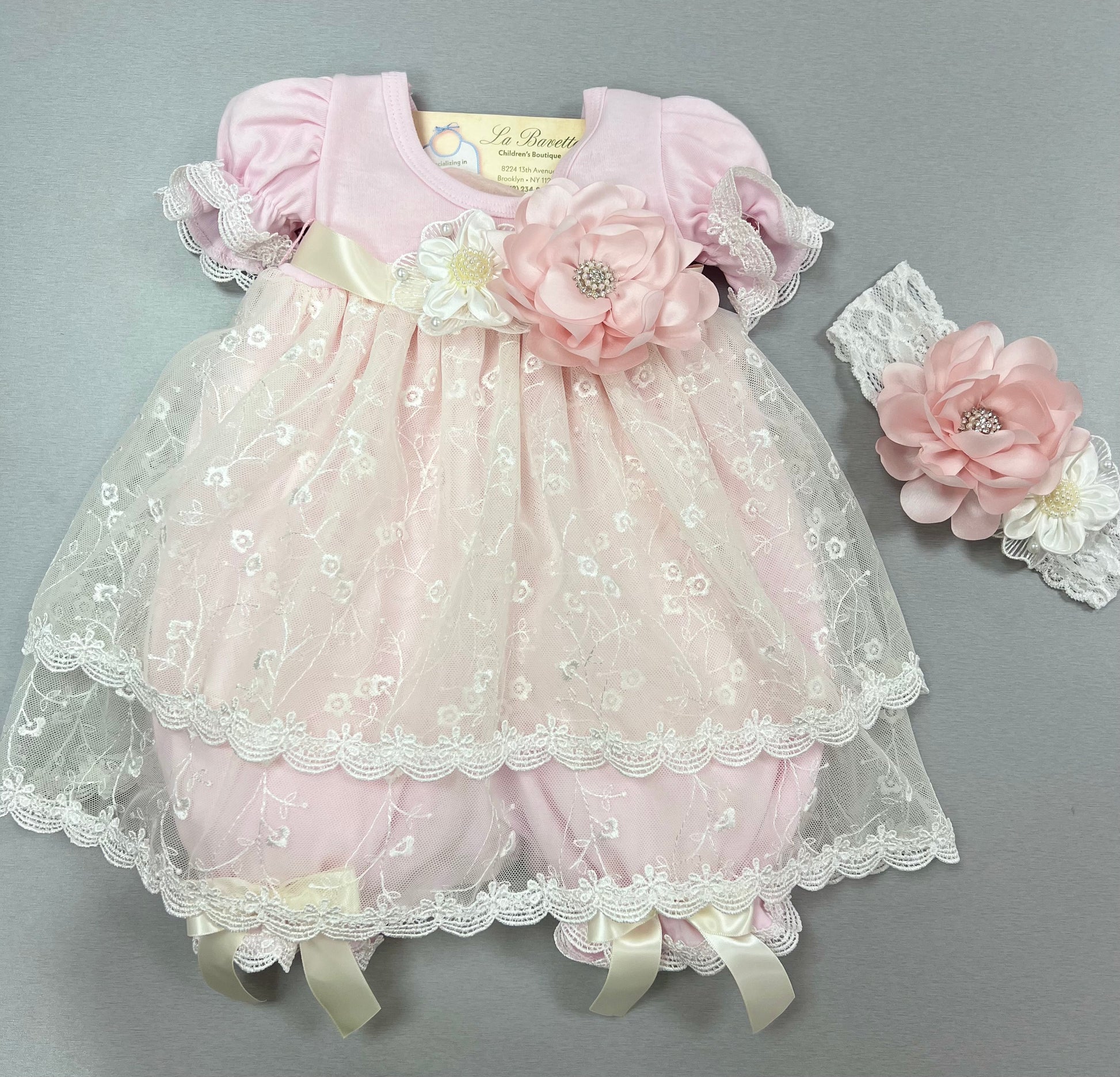 This romper one piece has a beautiful lace overlay ,short cap sleeve, finished with a satin hemline. Cute satin bows adorned on the elastic leg as well as a satin flower ribbon belt to finish the dress. Snap closures for easy closure.