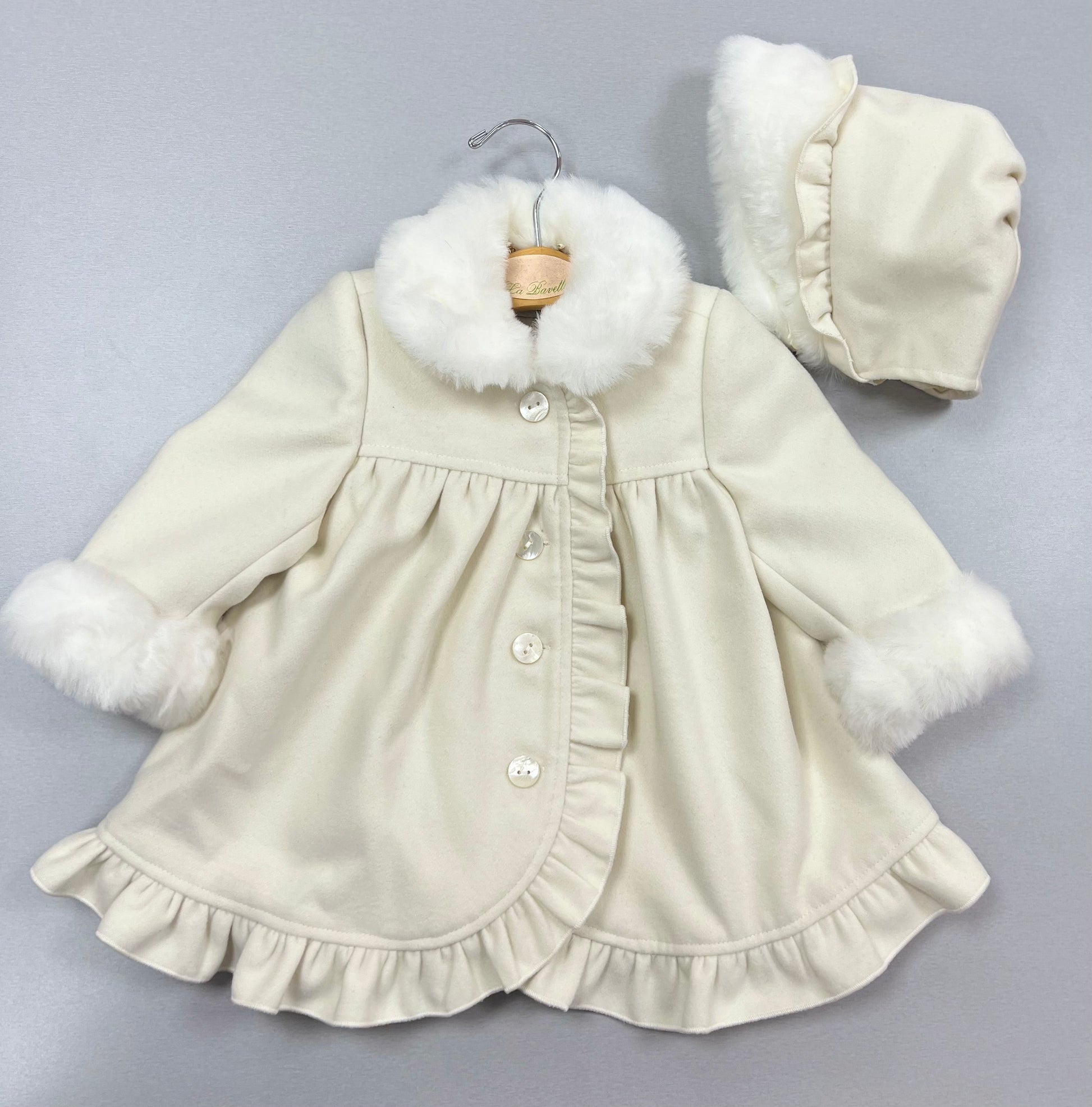 Wrap your little one in pure elegance with this exquisite coat and matching bonnet set. Featuring plush faux fur trim on the collar and cuffs, delicate ruffles, and charming pearlescent buttons, it's the perfect blend of warmth and timeless style for any special occasion. A truly adorable addition to their winter wardrobe!