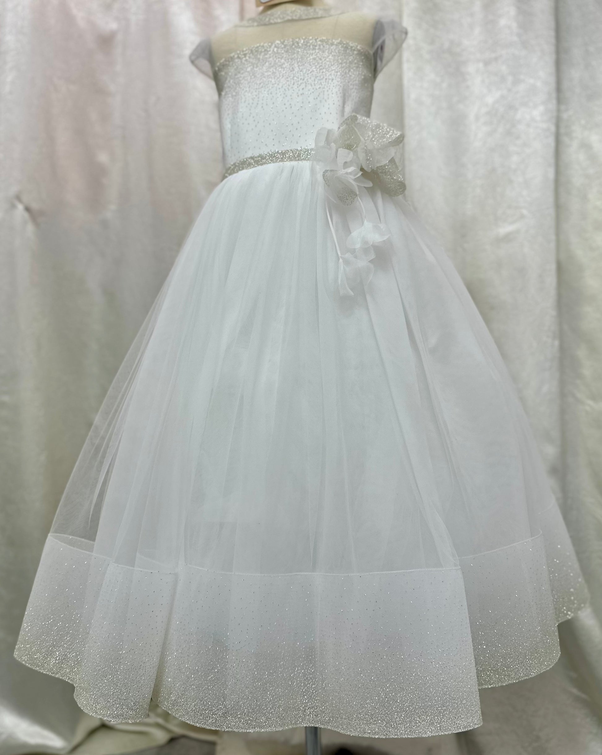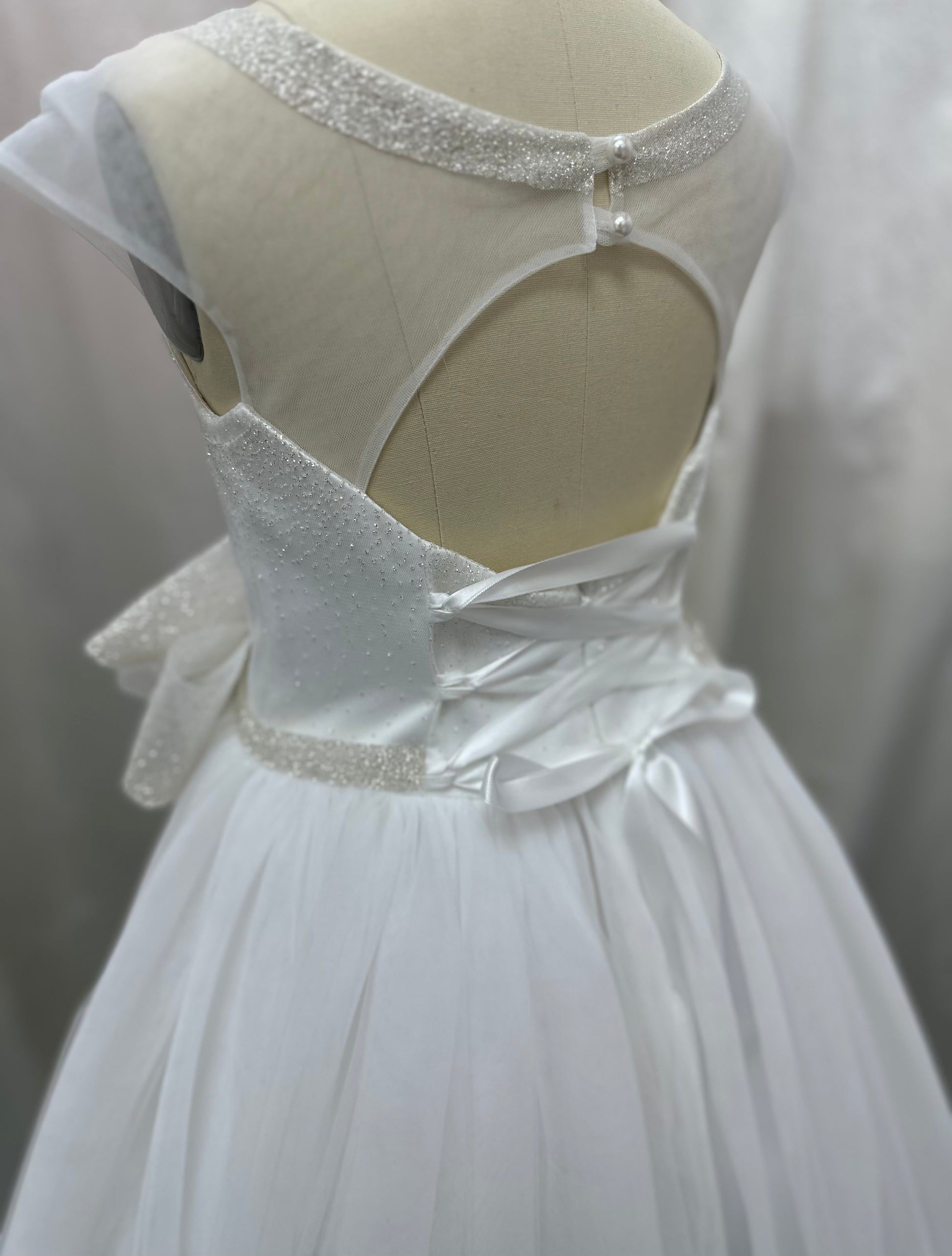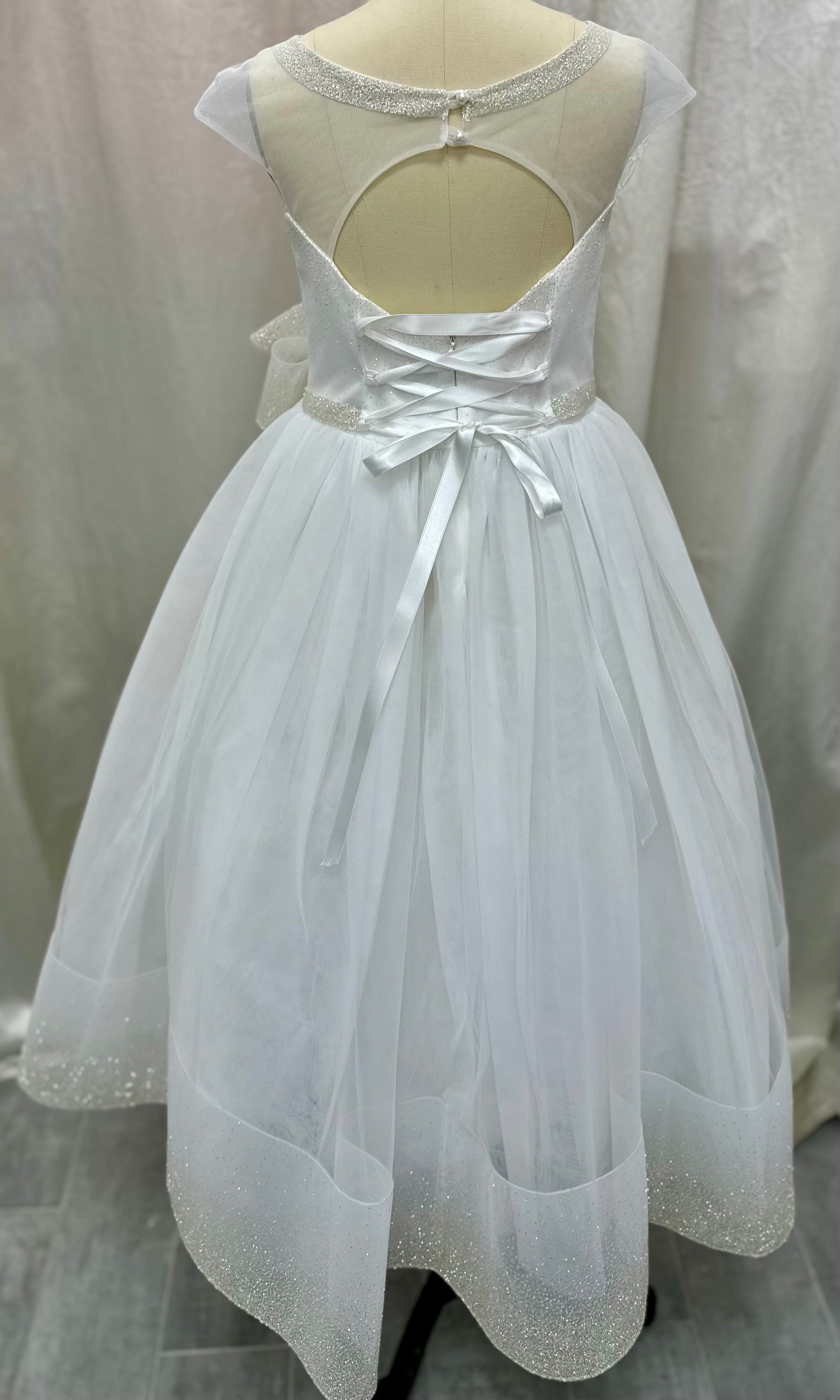 Made in Italy, Michelina Bimbi offers a lovely communion dress with shimmer detail all throughout the gown. The dress also includes a dramatic beautiful bow along the waistline to complete the look!